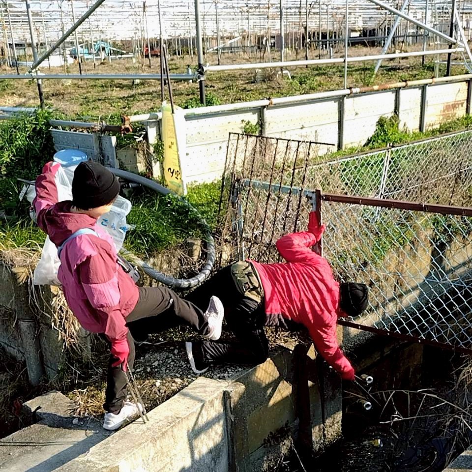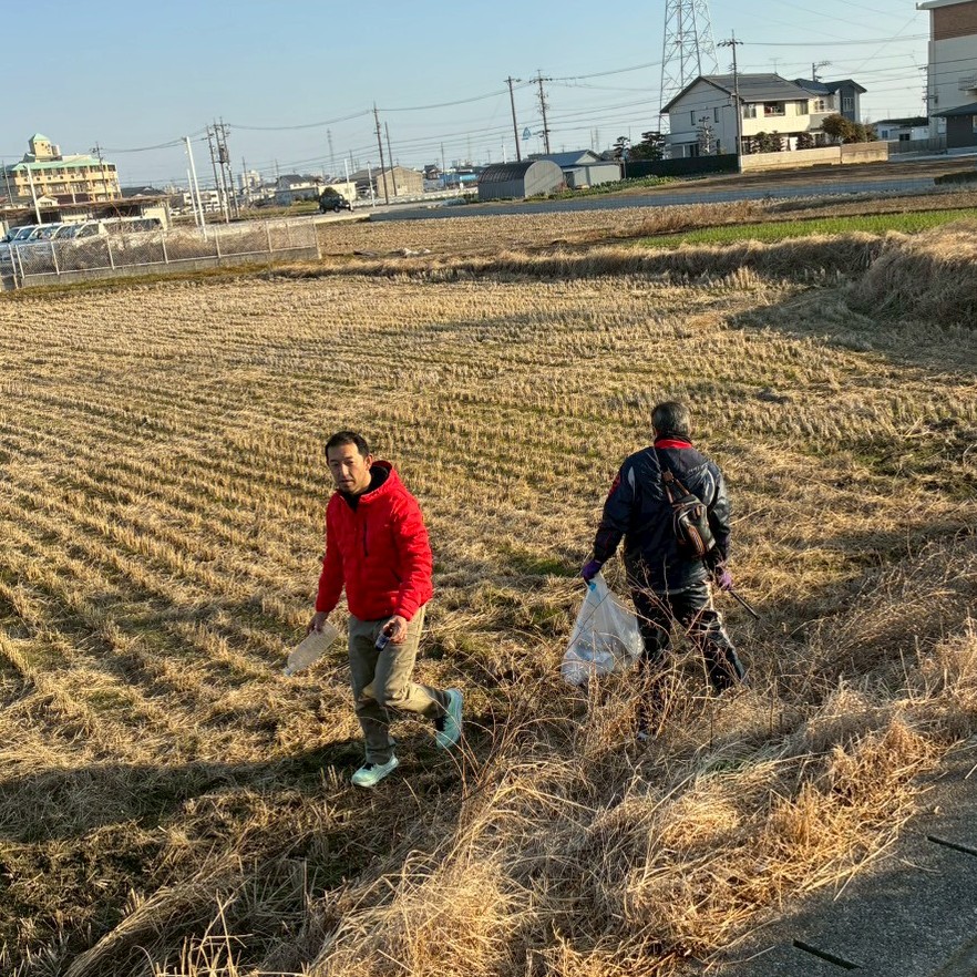 田んぼに入ってごみを拾います。